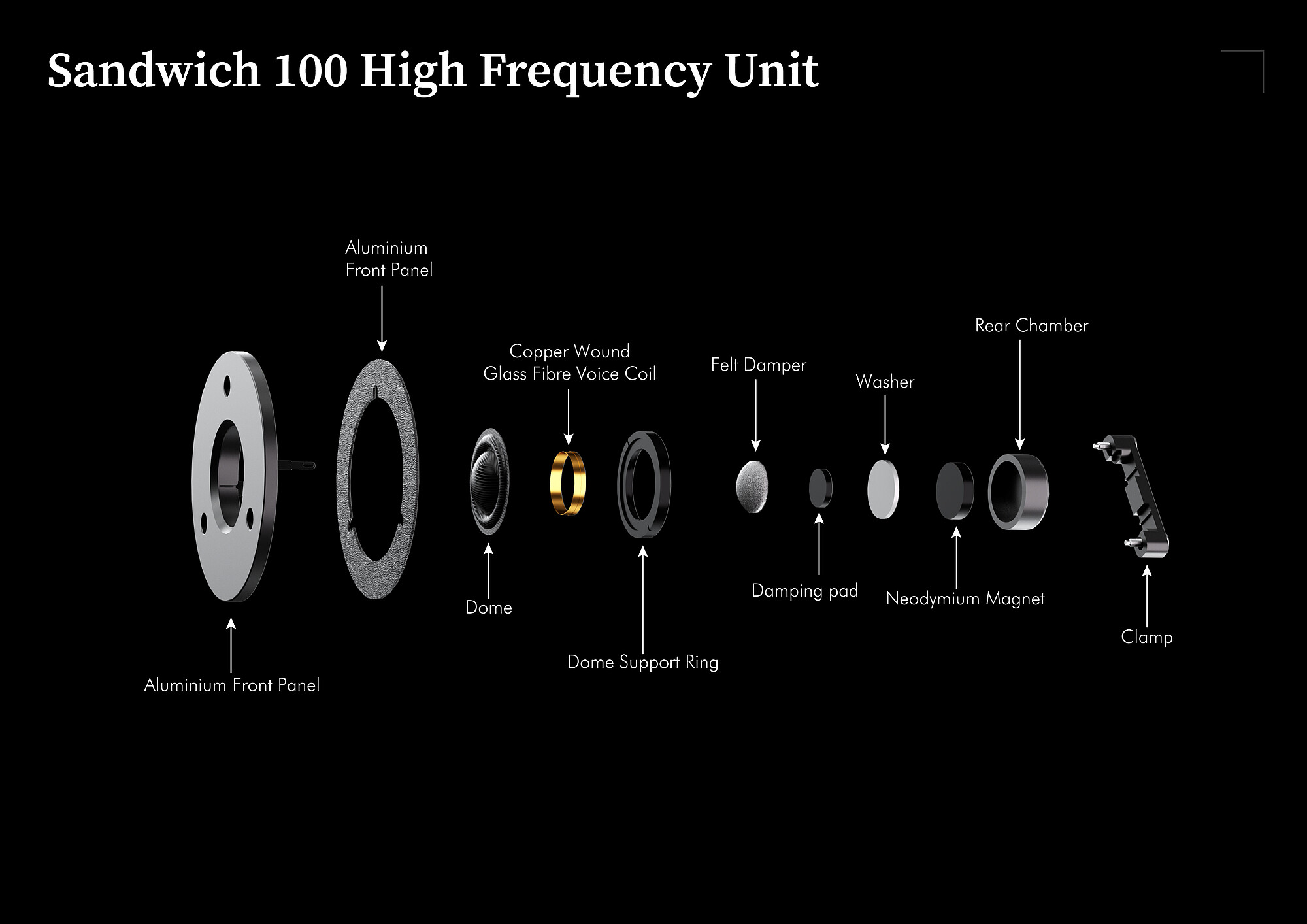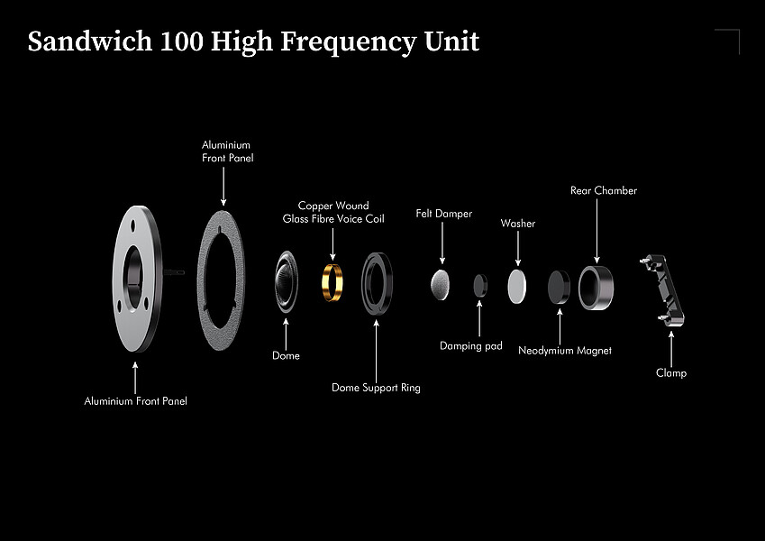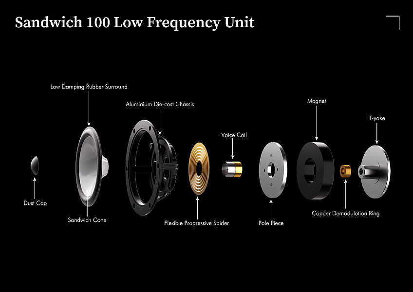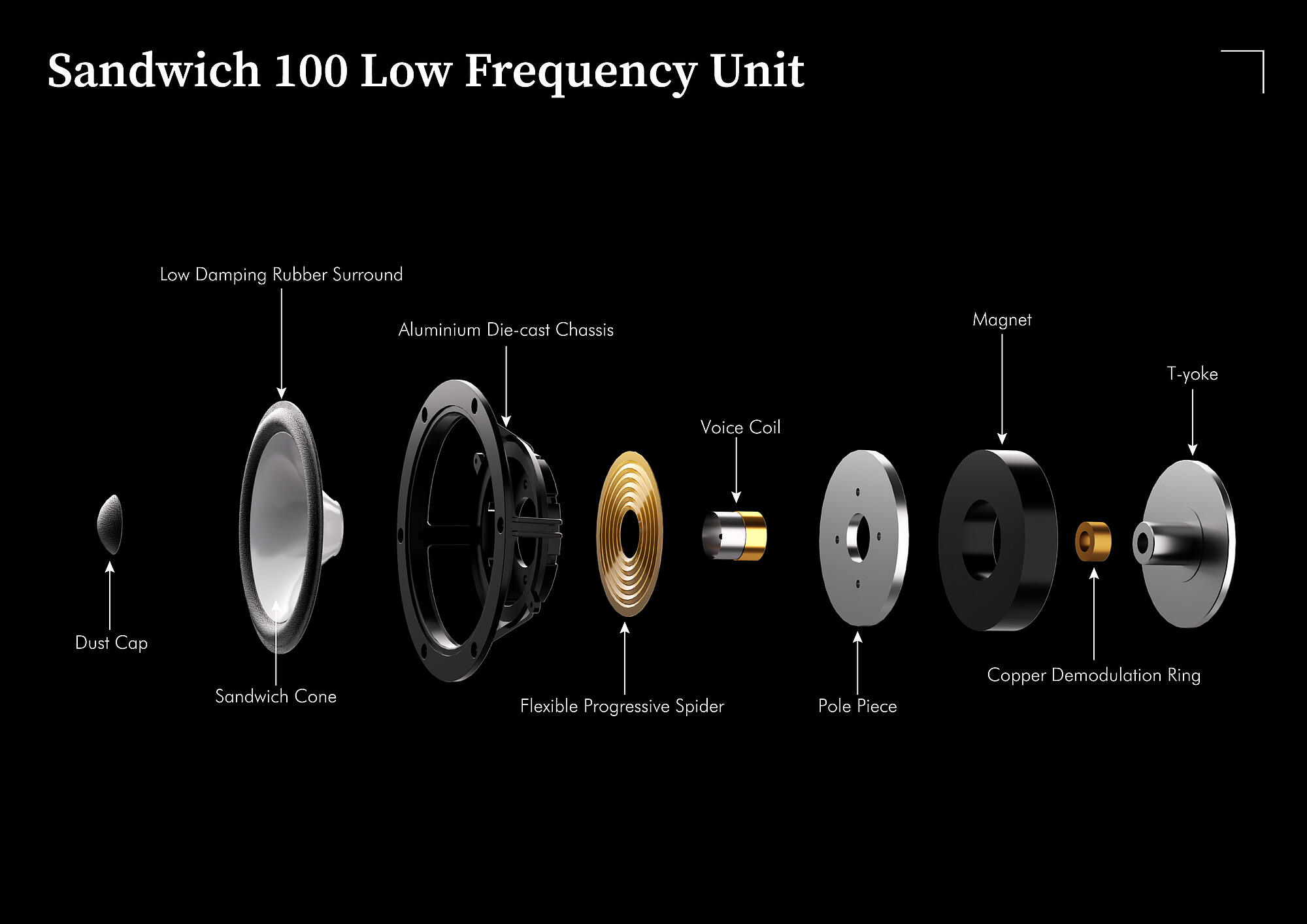Im Zentrum der LEAK Sandwich 100 arbeitet die neueste Evolutionsstufe der LEAK Sandwich-Membran. Der 5,75-Zoll-Mitteltieftöner nutzt einen strukturellen Rohacell-Schaumkern, der mit Aluminiumschichten verbunden wird. Zum Einsatz kommen dabei Klebstoffe in Luftfahrtqualität.