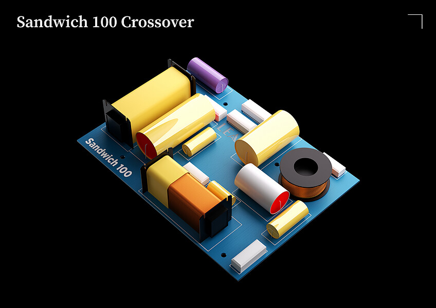 Die Frequenzweiche der LEAK Sandwich 100 wurde auf Basis umfangreicher Messungen und intensiver Hörtests entwickelt. Zum Einsatz kommen Polypropylen-Kondensatoren, Luftspulen und verlustarme Widerstände.